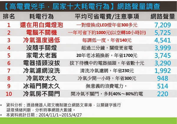 經濟部表示,上述10項行為,就是透過大數據找出的居家10大高電費兇手,當中跟冷氣有關的就有4項,若民眾在今年夏天能照著做,肯定能省下一筆可觀的電費,1年約可省下上千元。1040429